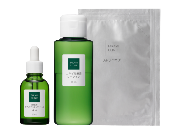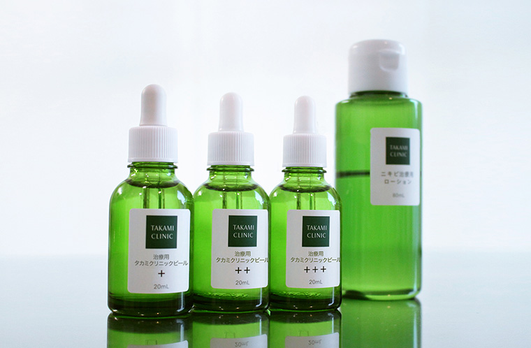 タカミクリニックにご来院の患者様のみに処方されるオリジナル治療薬。開院当初から時間をかけて開発し、治療実績を踏まえて改良を重ねてきた「治療用タカミクリニックピール(+、++、+++)」をはじめ、ニキビ治療用ローションなど、他では決して手に入らないタカミクリニックだけのオリジナル治療薬です。